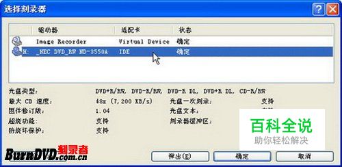第2步,打开“选择刻录器”对话框,在刻录器列表中选中准备使用的DVD刻录机,并单击“确定”按钮,如图2009012420所示 图2009012420 选择DVD刻录机
