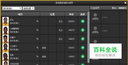 下图为添加球员列表 各位看到了吗?科比的身价只需要2000W就能把他招募到自己的球队当中,而且是整支球队最高身价。作为一个拥有8000W的蓝球经理来说,除了能科比之外,还能招募多几个中前场的得分点,像:杜兰特、霍华德等“壮汉”