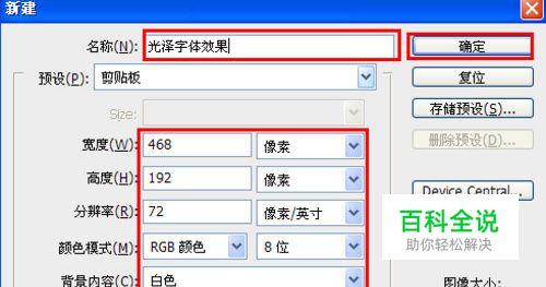 打开Adobe Photoshop 软件,执行菜单:“文件”/“新建”(快捷键Ctrl+N),弹出的新建对话框,名称:光泽字体效果,宽度:468像素,高度:192像素,分辨率:72像素/英寸,颜色模式:RGB颜色、8位,背景内容:白色,设置完毕后单击确定按钮,如图1所示。 图1