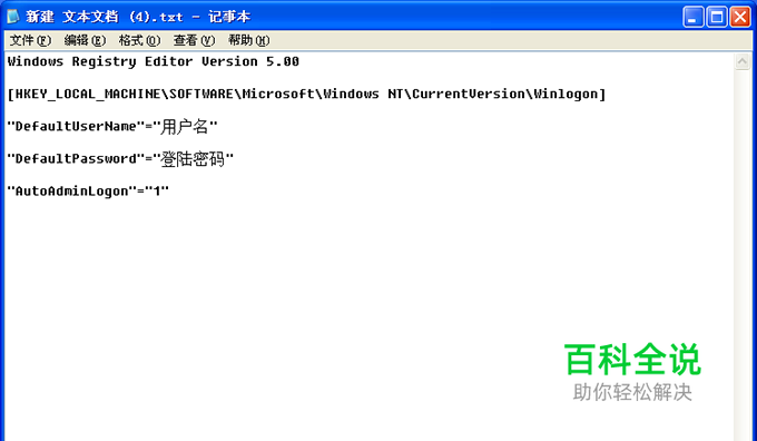 把下面内容复制到计事本,将字段中的 用户名与用户密码修改成您的相关账户信息,保存为.reg后缀文件,双击运行即可 取消WinXP系统登陆界面实现自动登陆! Windows Registry Editor Version 5.00 [HKEY_LOCAL_MACHINE\SOFTWARE\Microsoft\Windows NT\CurrentVersion\Winlogon]"DefaultUserName"="用户名""DefaultPassword"="用户密码" "AutoAdminLogon"="1"