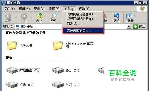 打开“我的电脑”单击菜单栏中的“工具”→“文件夹选项”。