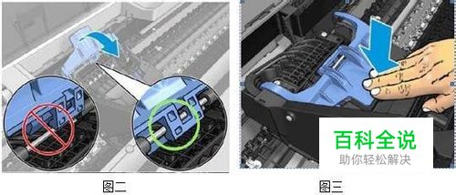 b)关上栓锁盖板后,蓝色上盖应该平整的盖在打印头上面,这样才能确保打印头正确的插在管道中,如图三所示 c)栓锁盖板合上后,你仍然可以推动笔架的后面来确定打印头是否装好,如图四所示