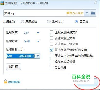 此时,弹出自定义配置。选择左侧的“压缩分卷大小”下面的下拉选项框。