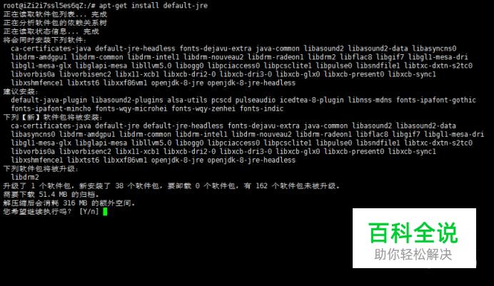 进入到终端界面,使用apt-get install default-jre进行安装,并输入y,按下回车。