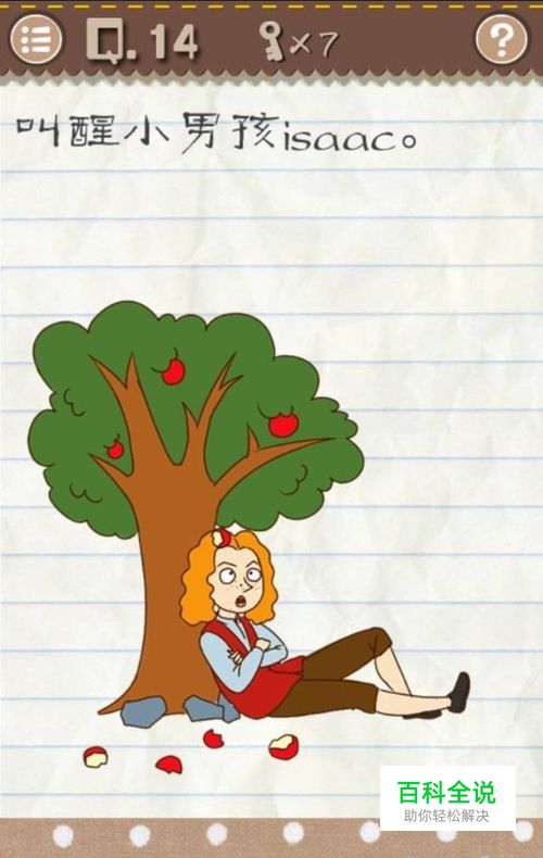 第14关;叫醒小男孩 小男孩是牛顿,只要摇晃手机,掉落的苹果就可以砸醒他了