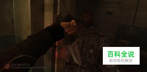 穿过一个狗洞来到一个木门的房间前,按中键可以踢开门,进去后自动进入子弹时间, 先把把桌子旁边的三个敌人干掉,然后再把屋里剩下的敌人杀光,杀光后从亮着绿灯的门杀出去。