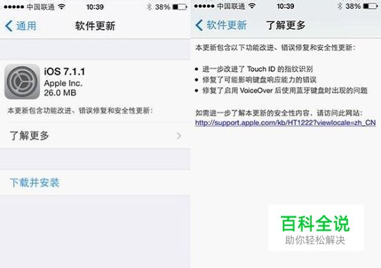 目前iOS最新的版本就是7.1.1啦,最近我更新了这个版本,使用了一段时间,想要说说我对这个版本的使用体验,分享给大家。 首先要更新的话,点击这个软件更新,然后下载并安装,就能更新到最新版了 这个版本的官方通告变化是,进一步改进了 Touch ID 的指纹识别,修复了可能影响键盘响应能力的错误,修复了启用 VoiceOver 后使用蓝牙键盘时出现的问题 进入界面,还是7.1的样子,本次更新的内容都是官方细微的小修小改,看不到实质性变化,一些错误修复及安全更新,并没有新增其它功能。包括流畅度,都是一开始和7.0.6跨越到7.1感觉一样流畅,毕竟重刷的新系统,你总有一种久违的很新鲜很快的感觉。一个大家很关心的问题就是目前还不能越狱,想要通过越狱来免费下载还做不到,不过可以通过使用快用苹果助手下载来弥补,快用苹果助手支持最新的iOS7.1.1系统,用它来下载是完全免费的。 我最大的使用感受就是7.1整个系统性能都获得很大提升,尤其是流畅度比较7.0.6以下系统要高几个层次,但快也有快之外的烦恼,比如耗电,就感觉用7.1比7.0.6还要耗电快,但是鉴于用了1个月,也开始逐渐习惯,但你要外出,肯定要外接移动电源,不然小半天就给你砍掉50%,让你伤不起,欲哭无泪,其它方面你找不到7.1有任何缺点,相反你用回7.0.6,你会极度不适应。总的来说,7.1.1还是非常值得升级的,推荐大家升级到最新版本。