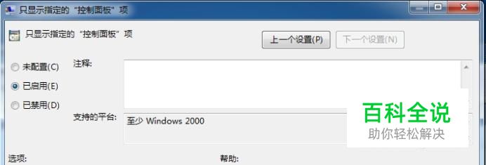 在“只显示指定的控制面板项”中,选择“已启用”并点击“确定”