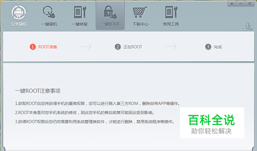 软件与手机连接成功后点击页面上方“一键ROOT”进入三星i8262d root页面,阅读页面的注意事项,之后点击“一键ROOT”,软件运行起来