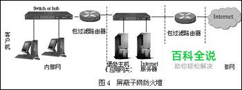 这种方法是在Intranet和Internet之间建立一个被隔离的子网,用两个包过滤路由器将这一子网分别与Intranet和Internet分开。两个包过滤路由器放在子网的两端,在子网内构成一个“缓冲地带”(如图