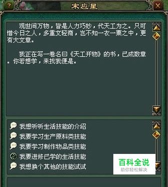 生活技能的学习及进修。玩家到30级时就可以通过杨家镇NPC宋应星选择学习生活技能。每位玩家只能学习一项原料生产类技能和一项物品制作类技能。 学习了生活技能后,可以在技能界面下的生活技能中,查看自己学会的技能。物品制作类技能可以从技能界面中拖动到快捷栏上。提升原料生产类技能,可以生产更高级的原料,并且可以同时在更多块地上进行生产。提升物品合成类技能,可以制造出更高等级的物品,并且可以获得更多的物品或者获得品质更高的物品。