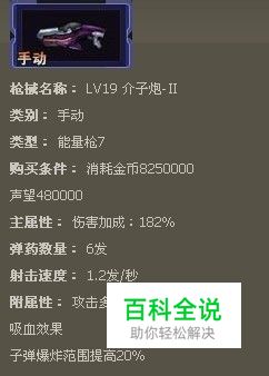 枪魂介子炮-II枪械属性介绍 能量枪系列 枪械名称: LV19 介子炮-Ⅱ 类别: 手动 类型: 能量枪7 购买条件: 消耗金币8250000 声望480000 主属性: 伤害加成:182% 弹药数量: 6发 射击速度: 1.2发/秒 附属性: 攻击多个敌人 吸血效果 子弹爆炸范围提高20%