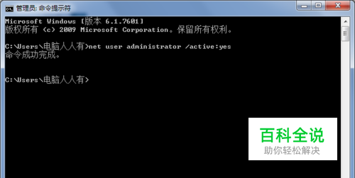 在命令提示符中输入: net user administrator /active:yes 回车执行命令开启Administrator账户。