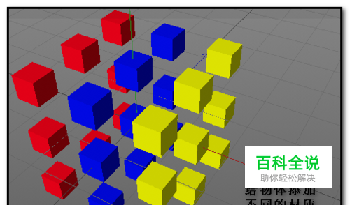 然后,在材质面板中,双击鼠标创建材质;设置材质为红色; 然后,按数字0,框选工具;把左边这一排立方体全框选中(本步骤第二张图); 再把材质拖到选中的立方体这里来。这些立方体即变成红色(本步骤第三张图)
