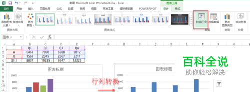 (2)在“图表工具”菜单的“设计”选项卡中可以通过“切换行列”按钮对图表的行和列进行转换,实现正确的数据图表呈现方式;