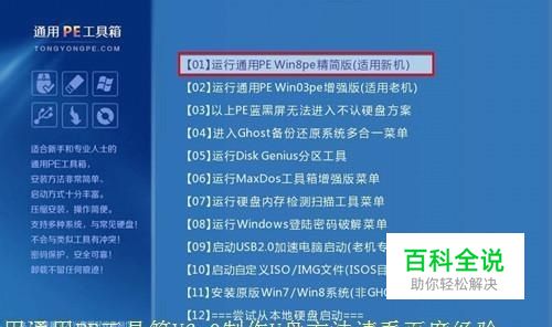 1.用通用PE工具箱V6.0制作的U盘一个启动U盘,详情请参看使用教程,制作完成后将GhostXP系统文件拷贝进U盘。 2.将U盘插上电脑,从U盘启动电脑,进入U盘菜单选择界面,选择【01】,进入WINPE系统,如图
