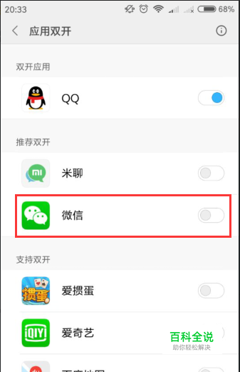 在双开列表页面,最上面是已经双开的应用,中间显示的是推荐双开,下面是支持双开的列表,这里为了演示效果,我们使用微信双开
