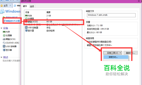接着选择对应的虚拟机系统,在虚拟机的"右上角"找到“编辑虚拟机设置”然后的跳出的菜单栏里找到选择的“硬盘”,接着选择“实用工具”点击下拉菜单的“映射”进入;