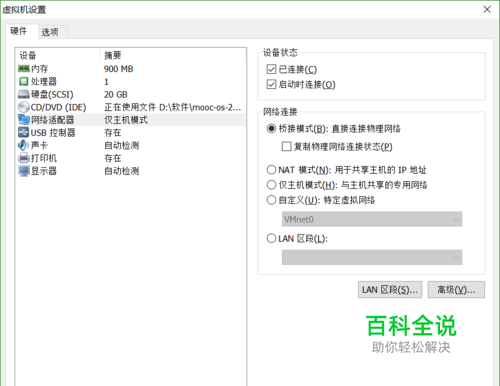 打开虚拟机设置: 一定要选择。 选择已连接:相当于让网卡充上电。 启动时连接:启动时自动连接到该网络链接方式。