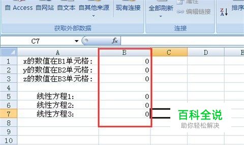 在excel文档中输入相关的参数,这里我们用单元格B1、B2、B3分别存储x、y、z的数值,用单元格B5、B6、B7依次显示第一个、第二个、第三个线性方程运算结果。