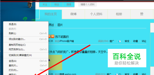 鼠标右击,可以看到弹出一个导航栏,此时选择查看代源码进去查看。等下会弹出一个新的网页的,那里就是她的微博的HTML代码。