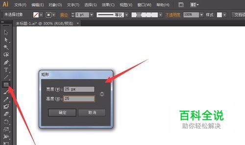 使用矩形工具,在画板上点一下,然后会弹出【矩形】窗口,宽度和高度都输入25px,单击【确定】。