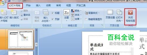 接着进入了“幻灯片母版”的操作模式,如果要退出这个模式可以图中位置处的“关闭幻灯片母版”即可,