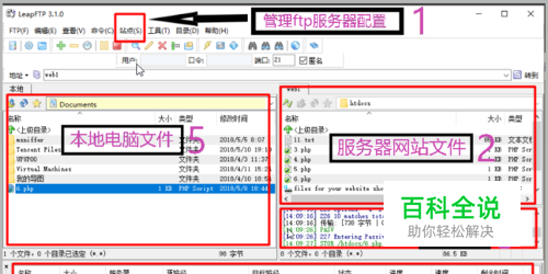 leapftp界面主要功能板块介绍 1.管理ftp服务器配置的地方 2.服务器网站文件窗口界面 3.上传状态的窗口界面 4.正在上传的文件窗口界面 5.本地电脑文件窗口界面