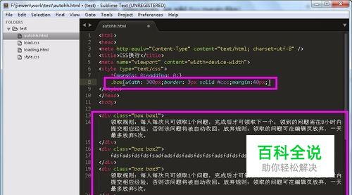 准备工作 启动编辑器,在编辑器里输入三段比较长的文本,并控制div容器box的宽度。用css定义box样式: .box{width: 300px;border: 3px solid #ccc;margin:40px;}