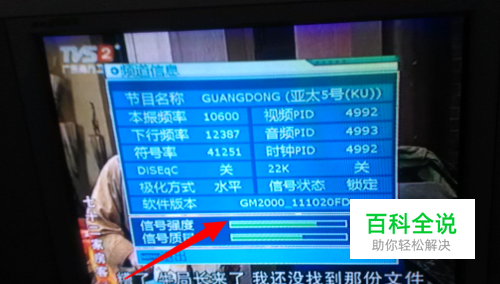 把锅放到楼顶,没有遮挡物的地方。连接好线。同时打开电视,看到图中的箭头的那里指示,就是线连接好了的。没有调星时候下面那信号质量是空的。我这里已经调好了,所以才会有下面的条子。 线没有连接好的,那么箭头那里是空的不会有条。注意了。