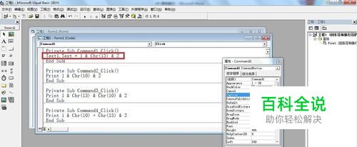 双击“回车换行”命令按钮,进入代码编辑窗口,输入如下代码: Text1.Text = 1 & Chr(13) & Chr(10) & 2