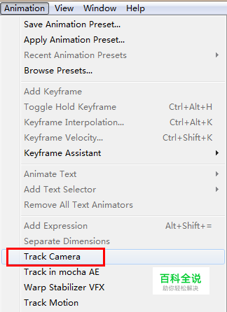 选中视频层,点击Animation→Track Camera,对视频层使用此特效。