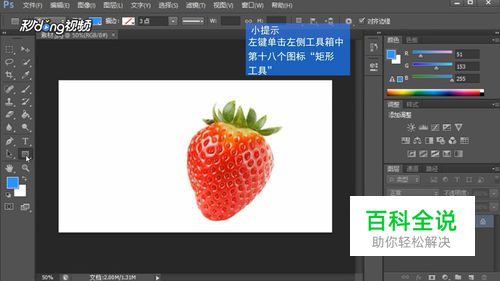 我们左键单击左侧工具箱中第十八个图标“矩形工具”,然后在草莓上按住左键不放,向右下方拖动一小段距离后松开鼠标,这样画面中就会出现一个矩形。