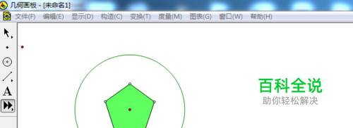 顺便交代一句,如何使用自定义工具里的正多边形工具画圆内接正多边形。我们以正五边形为例。先画一个圆。单击自定义工具,选择正多边形工具,选择正五边形。这时光标变成点,移动点使其与圆心重合,然后拖曳鼠标,向外拉。