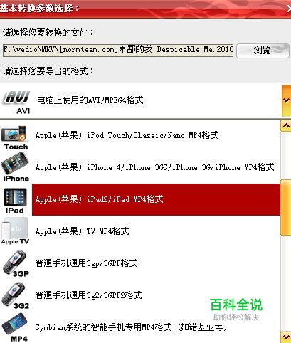 选择导出iPad的MP4格式 添加视频进入“基本转换参数选择”对话框后,选择导出iPad的MP4格式。苹果的系列产品,支持的视频基本为MP4、MOV,所以要把视频导入iPad,第一步便是转换格式,这需要使用到转换软件,目前对苹果产品支持最好的,便是专门针对移动硬件终端的《MP4/RM转换专家》,在苹果产品支持这一块上,其支持导出苹果全系列产品最符合官方标准的MP4格式,甚至支持官方未公布的1080P全高清MP4格式,喜欢尝试的朋友,还可以用软件导出1080P全高清视频,体验iPad高性能芯片带来的高清影音。