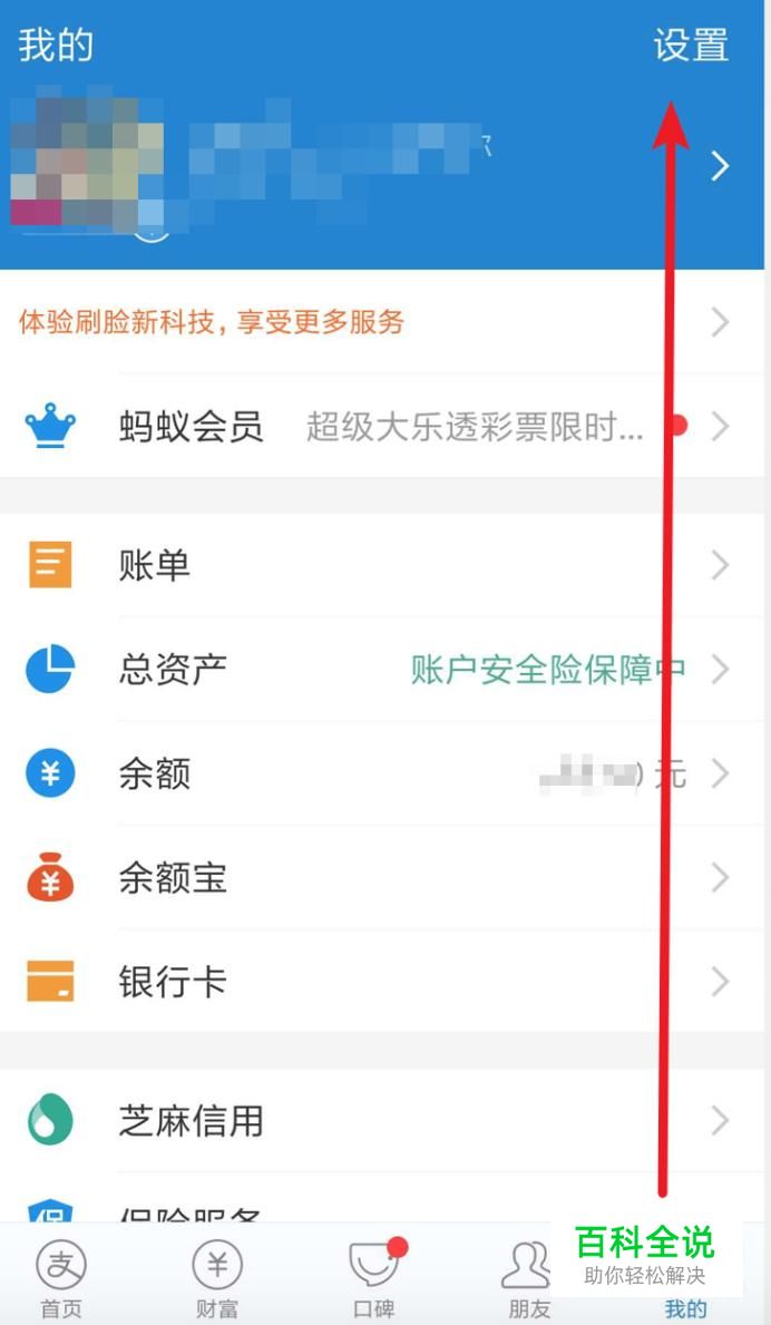 打开手机上的支付宝,在‘我’页面上,点击右上角的‘设置’