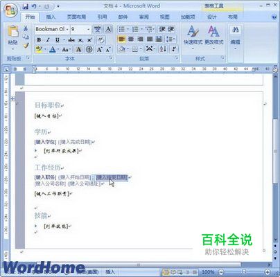 第3步,在新建的“原创简历”文档中,单击需要修改的项目,直接输入用户的实际内容即可,如图 小提示:除了使用Word2007已安装的模板,用户还可以使用自己创建的模板和Office Online提供的模板。在下载Office Online提供的模板时,Word2007会进行正版验证,非正版的Word2007版本无法下载Office Online提供的模板