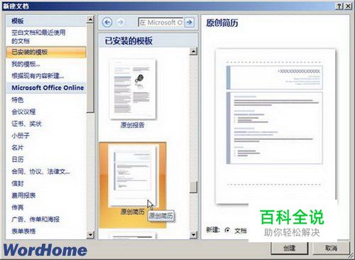 第2步,切换到“已安装的模板”选项卡,在“已安装的模板”列表中选中需要的模板(如“原创简历”),并单击“创建”按钮,如图