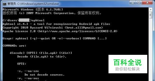②将解压出来的三个文件移动到C盘的windows目录下 ③打开CMD命令(方法在第一讲中有介绍),直接输入“apktool”,然后“回车” 如果没有提示错误信息,就说明安装成功(如下图)
