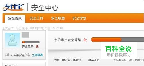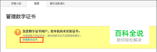 大陆个人用户安装数字证书 如果已申请数字证书,第二次在别的电脑上登录支付宝账户则会提示用户安装数字证书,登录支付宝账户——【安全中心】——【安全管家】,点击【数字证书】——【安装数字证书】;(若数字证书控件安装失败,怎么办?)