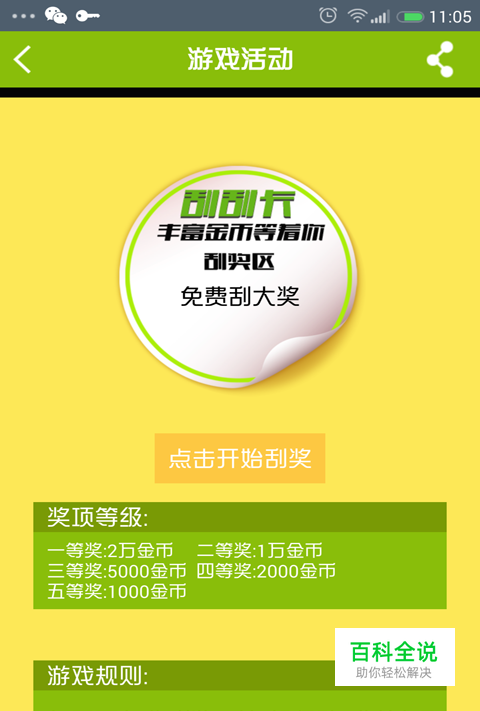 方法二:每天都有一次免费的刮刮乐赢大奖游戏,2W—1000不等金币,如果运气好的话,可以获得一等奖啦!