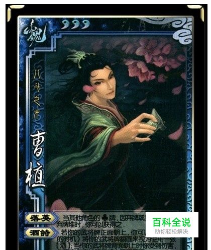 落英这个技能在没有配合的情况下完全看人品,梅花牌种类数量个人统计如下杀14,雷杀4,酒2,过河拆桥2,决斗1,借刀杀人2,南蛮1,无懈2,铁索4,乐不思蜀1,兵粮寸断1,+1马1,八卦盾1,仁王盾1,白银狮子1,藤甲1,诸葛连弩1,由此可见曹植可以靠落英得到大量的杀,锦囊都是少量的看人品,装备中防具是所有种类都有梅花,最关键是有个梅花诸葛,这个如果能拿到再拿到一堆杀真太人品了!但是请大家务必记住,一切人品都是不稳定爆发输出,所有判定牌没一个梅花我也见过。至于弃牌弃锦囊不可理喻,弃梅花杀都你的,弃装备,看场上时机发展。 酒诗这个技能,个人感觉因为曹植很可能有一堆杀,在消耗对方闪后用酒杀给予致命一击是很给力的,关键是把握时机,这个需要一定三国杀经验,而且你进入反面后要考虑下回合存活以及受到伤害翻回的血量问题。如果你把这个技能想成保命苟且偷生的,那你想多了,1血人头该走的还是要走的。