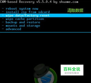 (下图可能与您手机显示的位置与颜色不一样,请选择与选项中相同的项目进行操作!) wipe data/factory reset 清除数据