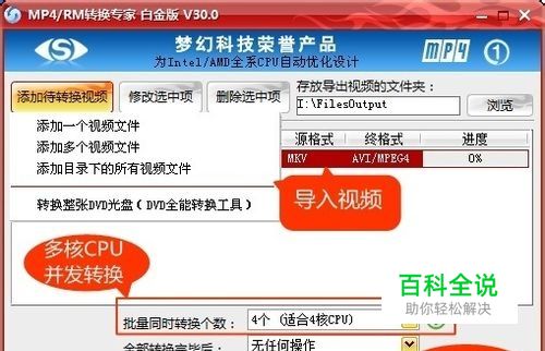 导入下载到的视频 《MP4/RM转换专家》支持导入几乎所有格式的视频,所以直接点击下图右上角的“添加待转换视频”按钮,即可添加在网上下载到的各种格式视频,如果喜欢的视频是刻录在DVD光盘的,那可以点击右下角的“DVD全能转换”工具,将光盘的视频和各种字幕、音轨、角度等信息以最快的速度完整的转换为各种移动设备支持的格式,如MP4/3GP/3G2/AVI等格式。 对于转换软件,我们都追求它运行稳定并且转换速度快,这款软件是最先开发并使用多核CPU并发转换技术的,并在IT权威网站“太平洋网”的专业评比中,新版获转换速度第一名。另外,在下图中,也可以看到,点击“暂停|取消转换”按钮还可以让当前正在进行的转换暂停或取消,细节处足见设计的人性化。