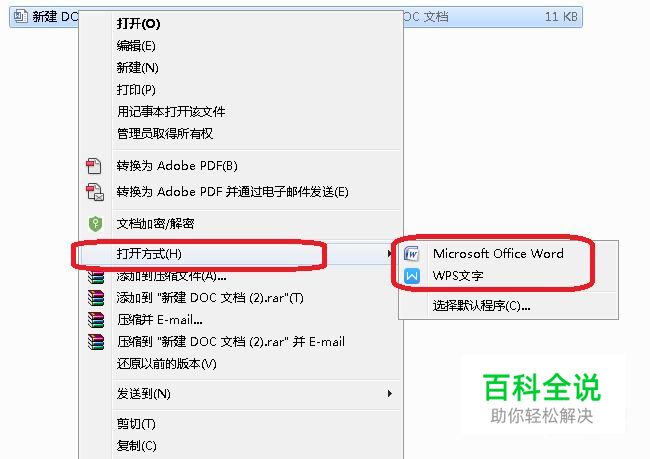 因为用WPS和WORD两种软件去掉文字背景的方法基本相同,下面我们只用WPS来演示,右键单击文档, 弹出菜单,如图所示,可以用WPS和WORD两种方式打开文档,有兴趣的朋友可以比较一下两者去掉底纹方法的不同。