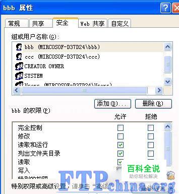 接着打开服务器系统的资源管理器窗口,找到D盘下面的“aaa”目录,然后用鼠标右键单击该目录窗口中的子文件夹“bbb”,并执行右键菜单中的“属性”命令,打开B部门信息上传目录的属性设置窗口,单击该设置窗口中的“安全”标签,再在该标签页面中单击“添加”按钮,从弹出的“选择用户或组”列表中将“bbb”用户帐号选中,再单击“确定”按钮返回到安全标签设置页面(如下图所示), 并在该页面中赋予“bbb”用户帐号合适的访问权限。