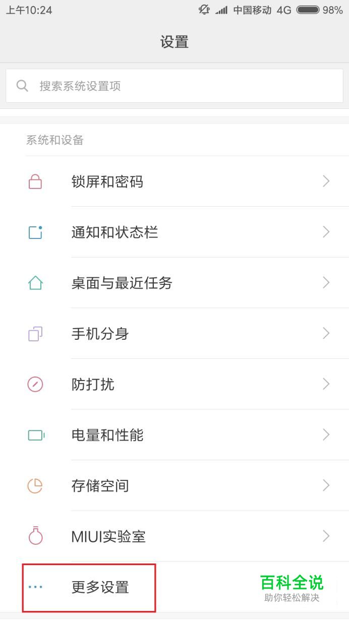 先打开旧手机上的MIUI设置应用,在设置应用界面,点击选择“更多设置”菜单选项。