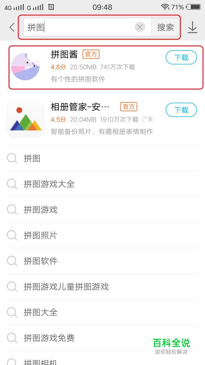 首先,打开系统自带的应用商店,搜索下载拼图软件app,在搜索结果中选一个下载安装,比如我本次演示安装“拼图酱”app。