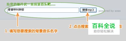 1、登录QQ邮箱进入“写信”页面,点击主题输入框下面的文字链接“背景音乐”; 2、出现输入对话框后,点击搜索音乐,弹出搜索页面,输入要找的背景音乐名字; 3、点击"搜索mp3",出现搜索结果列表中,点击其中一首歌曲名链接,弹出详情页面; 4、在详情页面中,选中来源地址,单击右键出现菜单,选择“复制”来源地址(请勿在选中来源地址后直接Ctrl+c复制); 5、将复制到的背景音乐网络地址,粘贴回写信页面背景音乐输入框中; 6、点击“确定”,成功给这封邮件插入背景音乐; 7、填写好收件人、主题(目前背景音乐仅支持QQ邮箱用户之间分享),点击发送,即这封带背景音乐的邮件发送到您的好友; 8、您的好友收到您的邮件后,打开阅读。背景音乐将会自动播放,播放器置于页面底部。