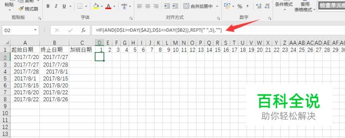 接下来就要用到函数了。 在D2单元格中输入函数:=IF(AND(D$1>=DAY($A2),D$1<=DAY($B2)),REPT(" ",5),"") 不好记这个函数,大家可以直接复制小编的。